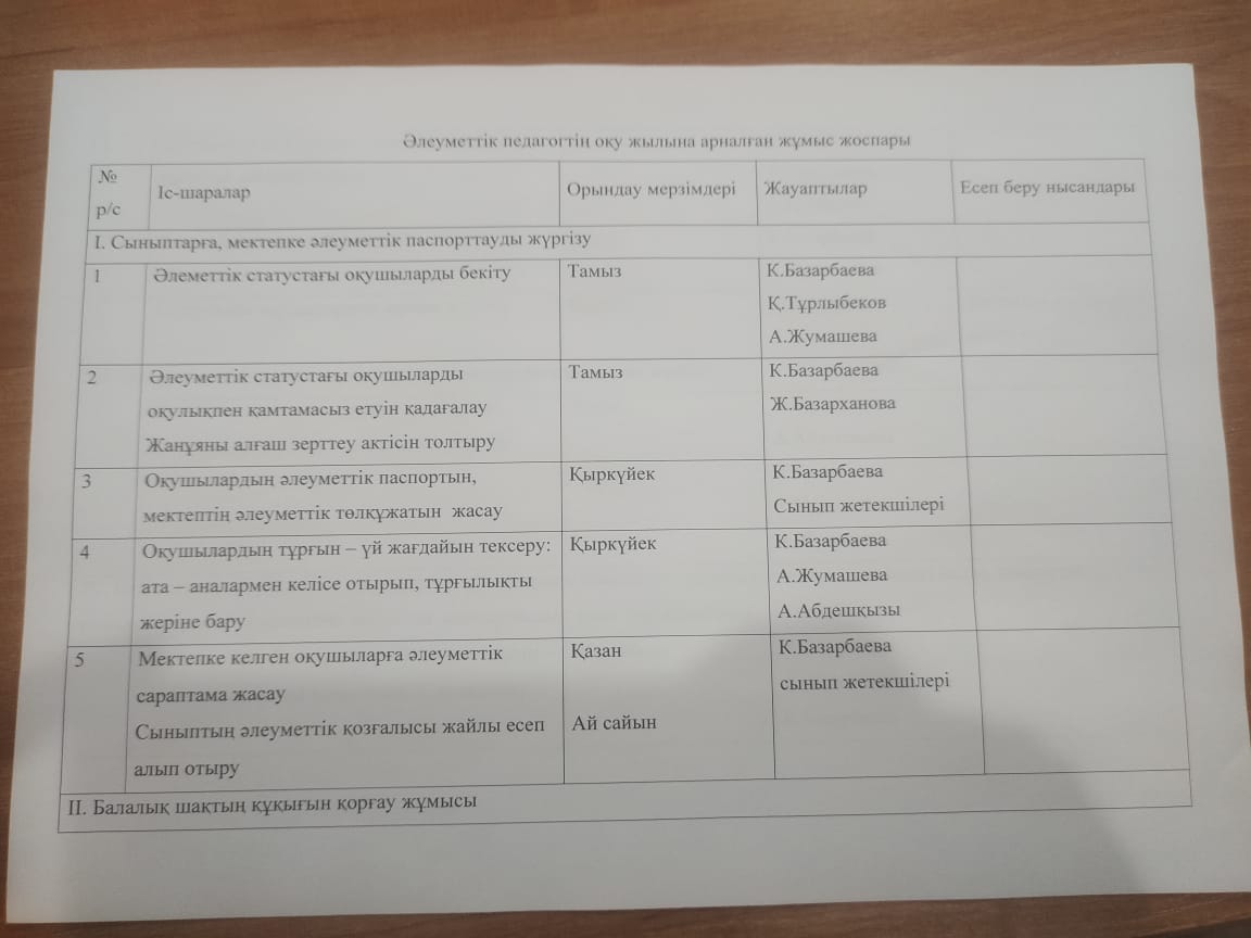 2023-2024 оқу жылына арналған әлеуметтік педагогтың жылдық жұмыс жоспары » Қабанбай батыр атындағы орта мектеп