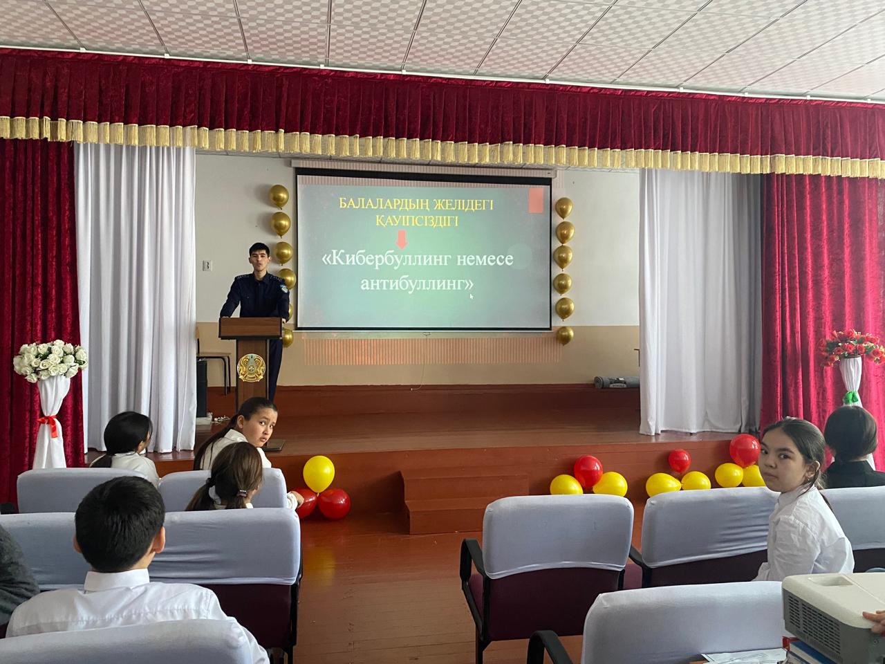Біртұтас тәрбие бағдарламасына сәйкес 12 ақпанда ДТІЖО А.Жумашева 6-11 сынып оқушыларына «Балалардың ақпараттық қауіпсіздігін және цифрлық сауаттылығын қамтамасыз ету», «Кибербуллинг», "Құқық бұзушылытың алдын алу" туралы ескерту, білім алушылардың жеке қауіпсіздігі, балалардың терезеден құлауының алдын алу мен судағы қауіпсіздік туралы ескерту жұмыстарын жасап, алдын-алу шарасын жүргізді. Кибербуллинг, бопсалау, ақпараттық қауіпсіздік туралы ескерту жұмыстарын жүргізу мақсатында Алакөл АПБ ЖПҚБ ЮПТ инспекторы полиция капитаны Э.Жармухаметовпен қатысты.