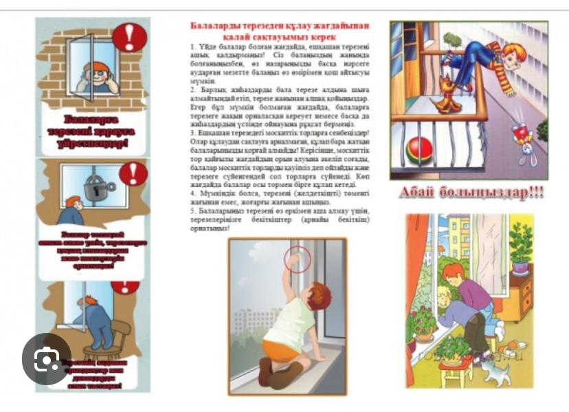 Бала терезені өз бетімен ашып алмауы үшін терезеге блокираторлар орнатыңыз! Егер балаға терезеден бір нәрсе көрсететін болсаңыз, оны жақсылап бекітіңіз, баланың шапшаң қимылдарына дайын болыңыз, алақандарыңызды құрғақ қылып ұстаңыз, баланы киімінен ұстамаңыз.