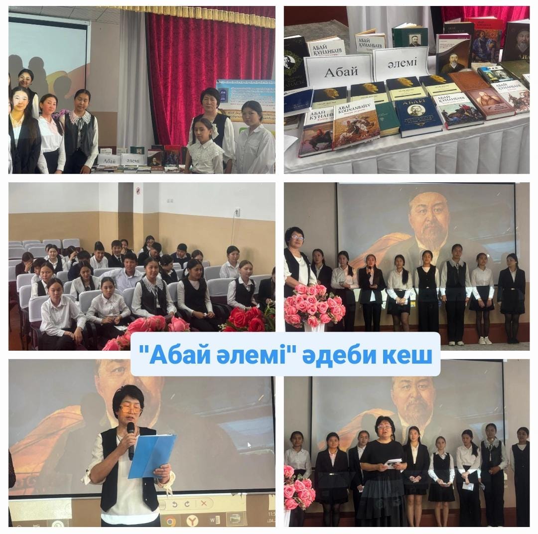 Ұлы ақын Абай Құнанбаевтың 180 жылдығына орай «Абай әлемі» әдеби кеші 8-10 сынып оқушылары арасында өткізілді.Ұйымдастырған директордың ТІЖО А.Жумашева, кітапханашы Ж.Базарханова.