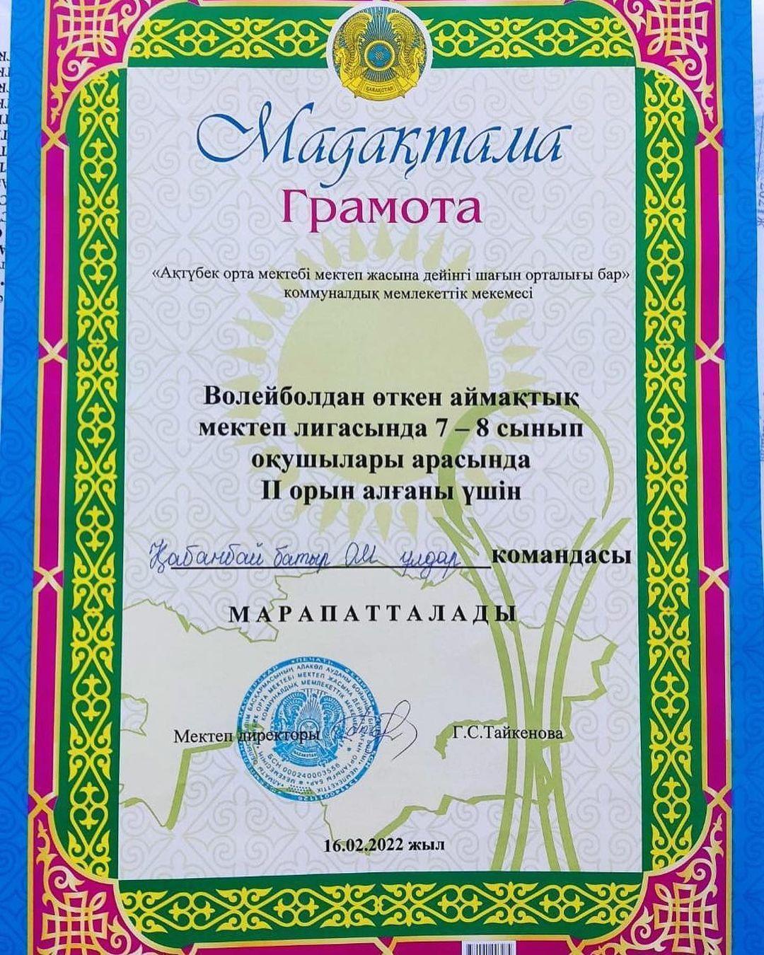 16 февраль 2022 0 1 2 3 4 5 Аймақтық «Волейбол» жарысы Аймақтық мектеп лигасы «Волейбол» жарысында 7-8 сынып ұлдар командасы ІІ-орын, 9-11 сынып қыздар камандасы ІІІ-орынмен марапаталды. марапаталды.