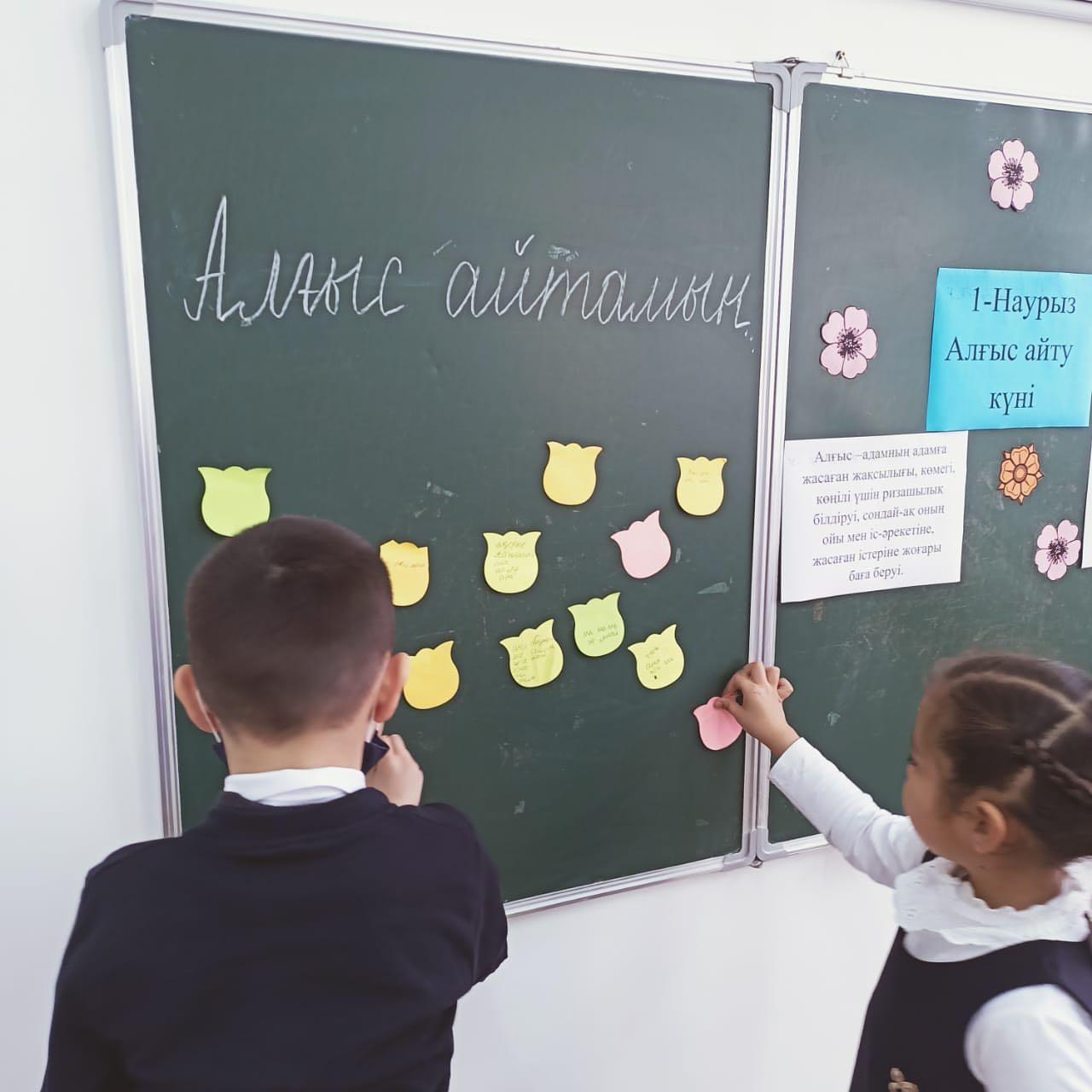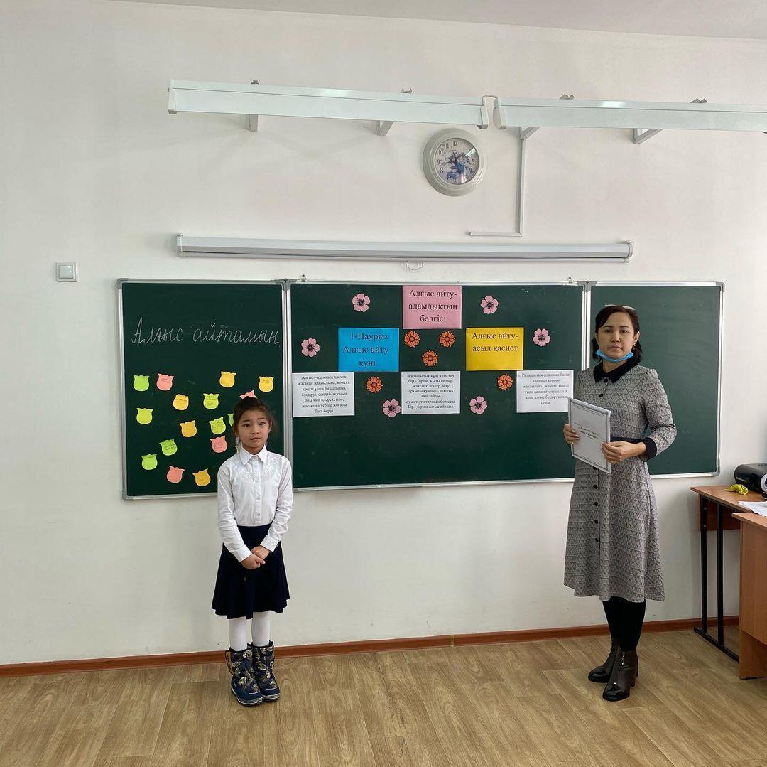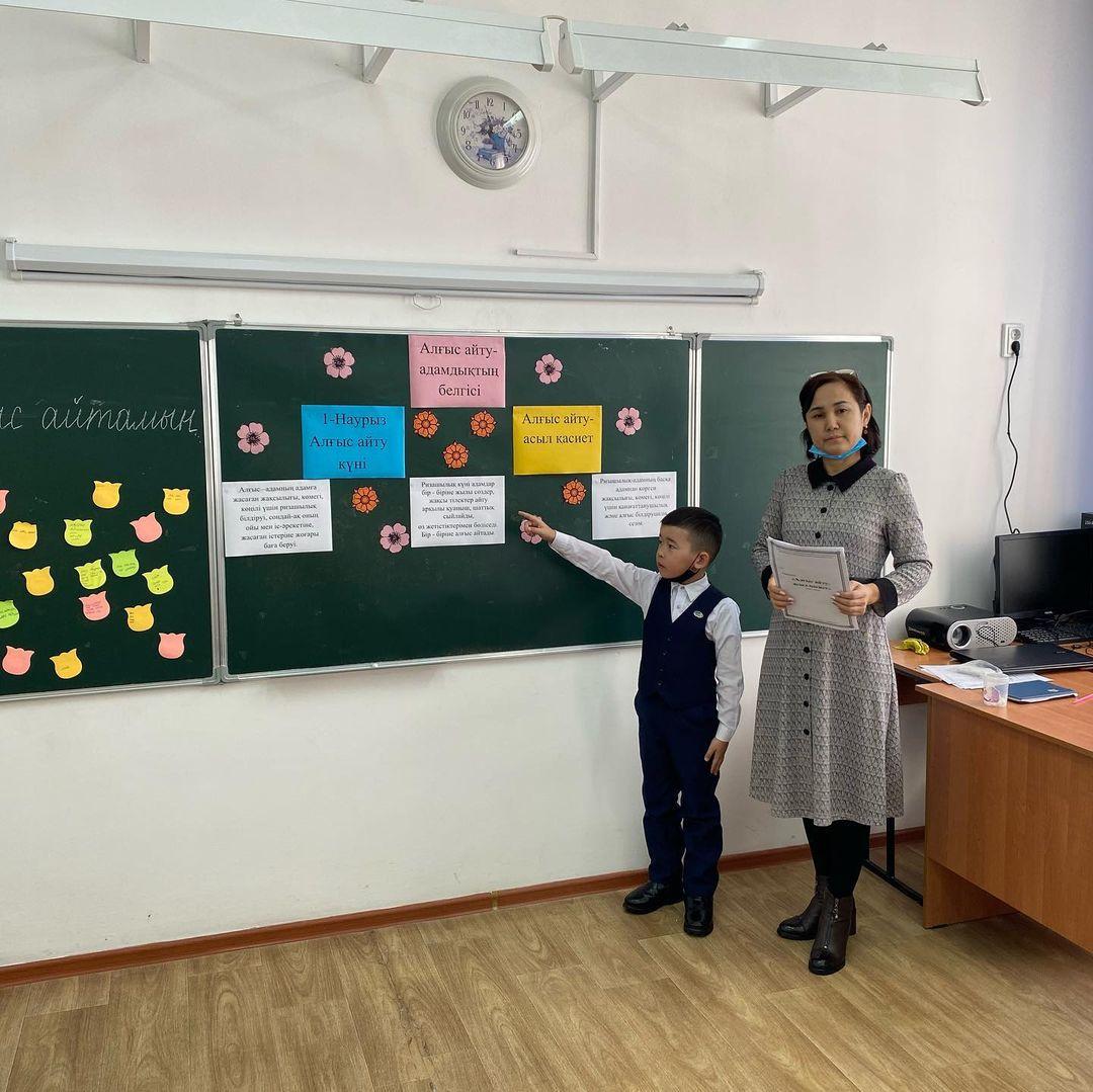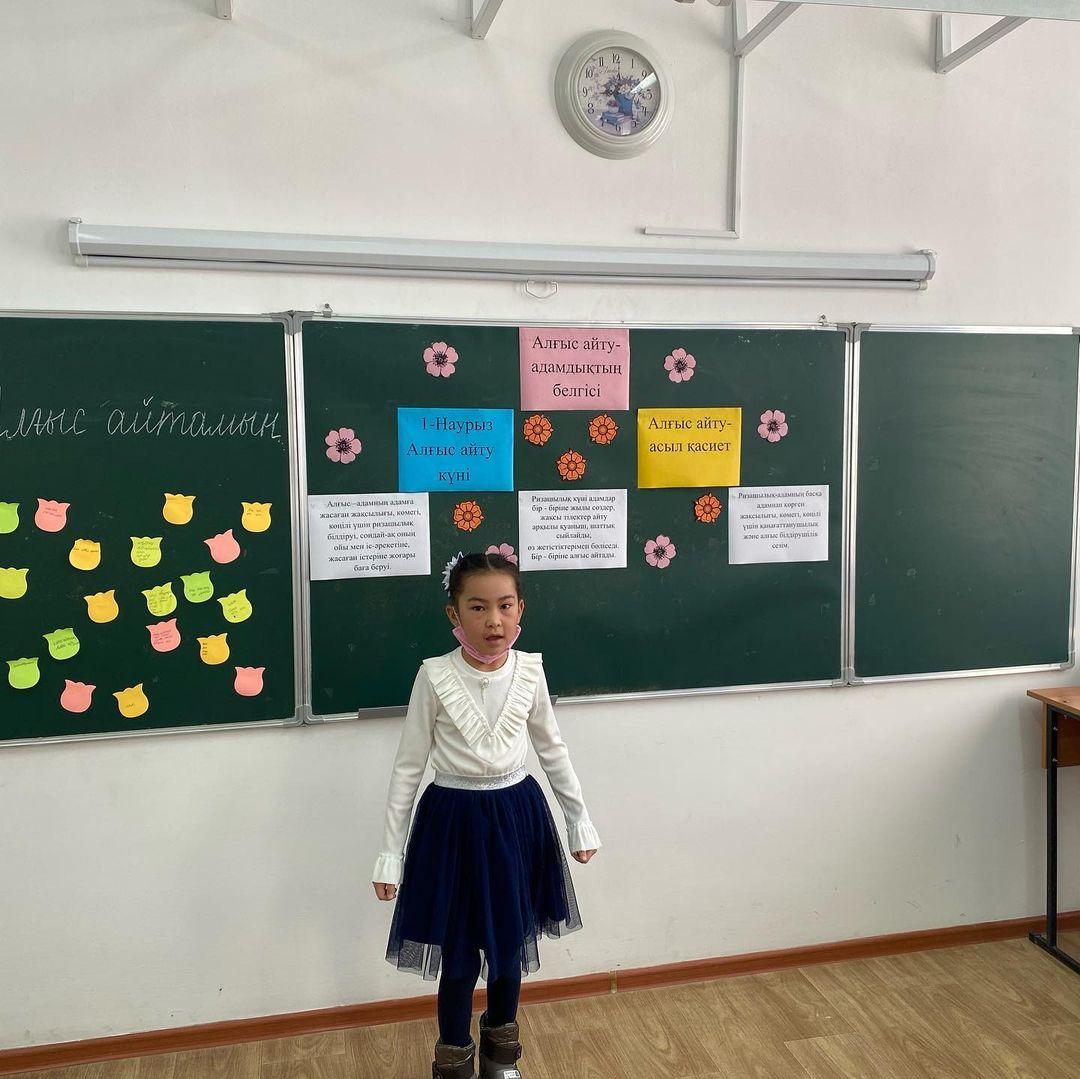 1-наурыз- Алғыс айту күніне орай 1"А" сыныбында сыныптан тыс іс- шара өтті. Сынып жетекшісі Тинибаева Меруерт Бейсенжановна. Сынып сағатының тақырыбы: Алғыс айту- асыл қасиет. Мақсаты: Оқушылардың Отанға, жанұяға, үлкенге- кішіге сүйіспеншілік, сыпайылық қарым- қатынастарын дамыту. Ризашылық пен алғыс, жақсы тілек, ізеттілік туралы түсініктерін кеңейту. Бір- бірімен жақсы қарым-қатынас жасай білуге үйрету. Бейбітшілікте, татулықта өмір сүруге тәрбиелеу.