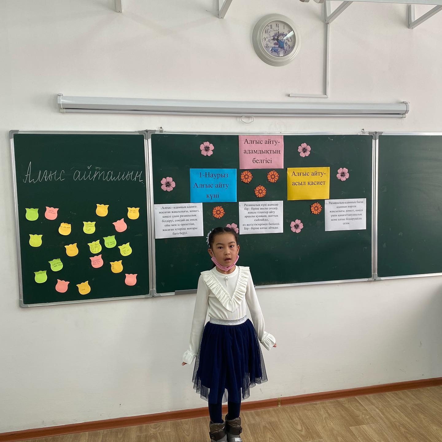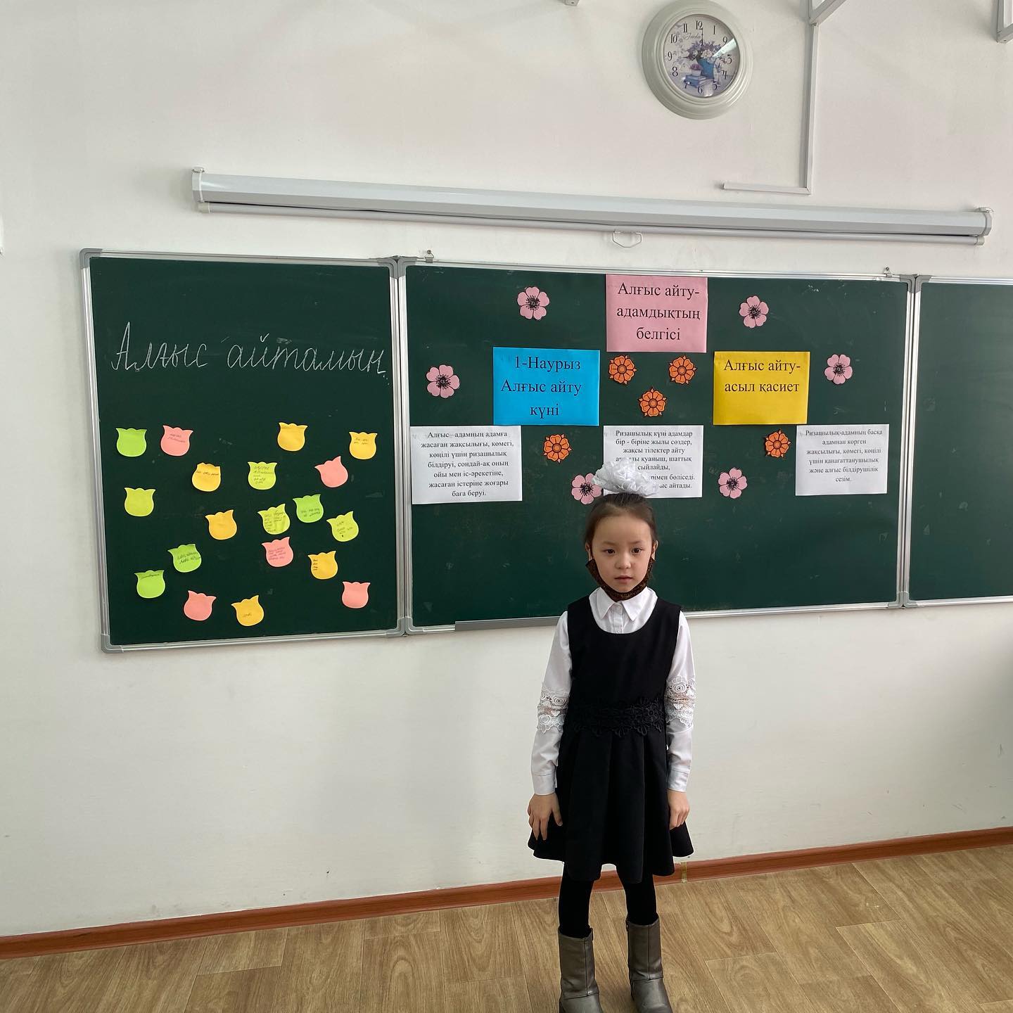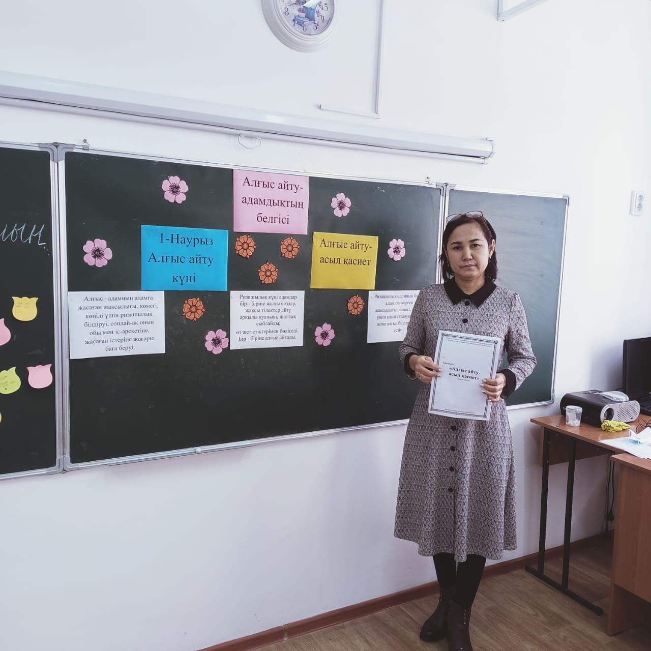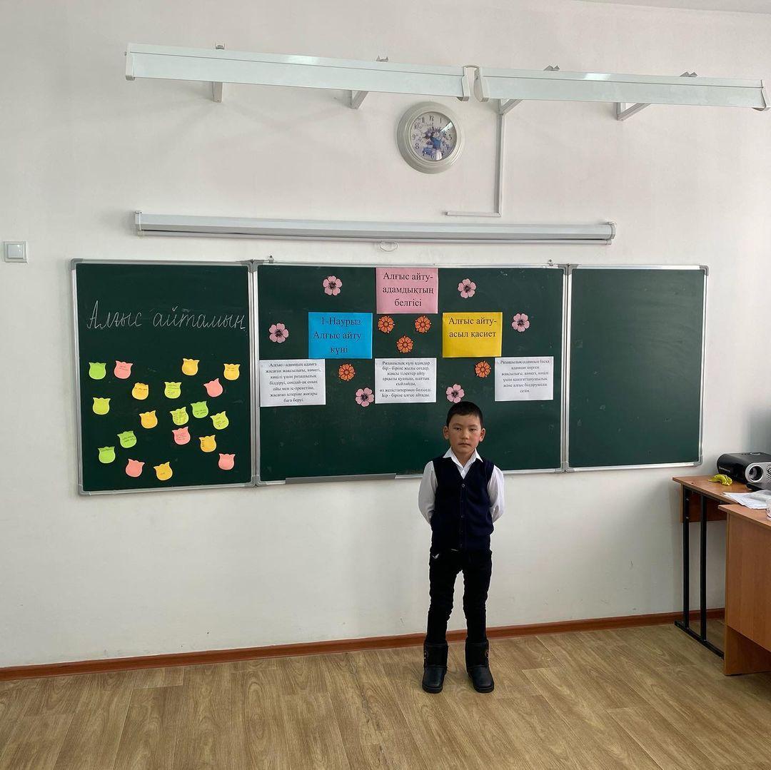1-наурыз- Алғыс айту күніне орай 1"А" сыныбында сыныптан тыс іс- шара өтті. Сынып жетекшісі Тинибаева Меруерт Бейсенжановна. Сынып сағатының тақырыбы: Алғыс айту- асыл қасиет. Мақсаты: Оқушылардың Отанға, жанұяға, үлкенге- кішіге сүйіспеншілік, сыпайылық қарым- қатынастарын дамыту. Ризашылық пен алғыс, жақсы тілек, ізеттілік туралы түсініктерін кеңейту. Бір- бірімен жақсы қарым-қатынас жасай білуге үйрету. Бейбітшілікте, татулықта өмір сүруге тәрбиелеу.